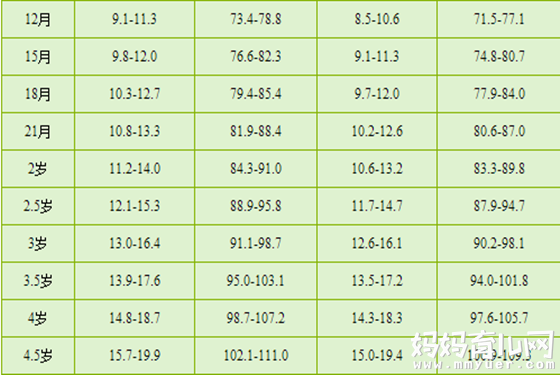 生长指标:男宝宝体重6.86-13.34kg,身长66.4-82.1cm;女宝宝体重6.53-12.52kg,身长64.9-80.5cm。