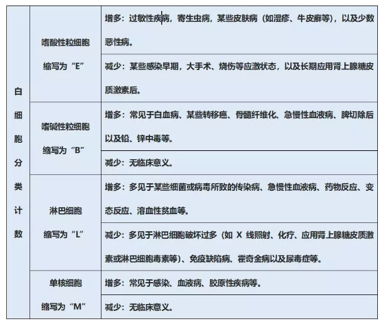 白细胞分类计数,则指各类白细胞的数量和百分比,可作为部分疾病可能性的参考。