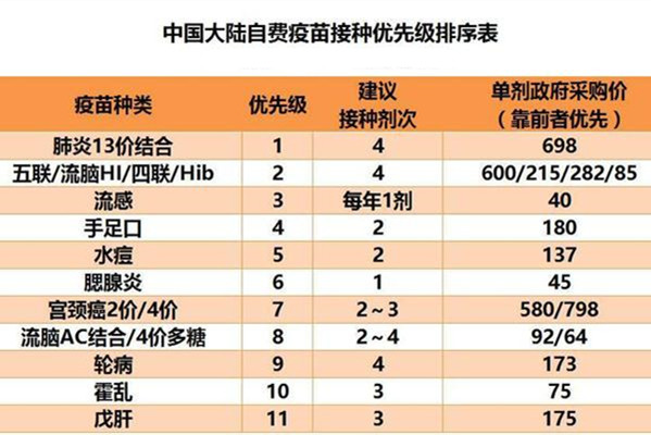 为什么现在有免费疫苗和自费疫苗的出现,选择性增大之后免费疫苗照常打,但是自费疫苗的话一定要先打这五种疫苗:肺炎疫苗、流脑疫苗、流感疫苗、手足口疫苗、水痘疫苗!这五种病情的发病率极高,尤其是在幼儿园,最常见的就是手足口和水痘的发病率和发病严重性最大!以下最详细的2018年自费疫苗价格表请收好!