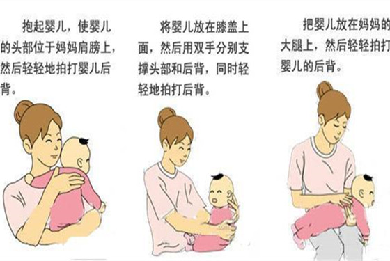 动作要领:妈妈自己坐在沙发上舒服的往后靠,让宝宝很自然的趴在妈妈身上,记得宝宝的状况要高于胃部,这样是为了防止奶水逆流,妈妈用手轻轻的拍打宝宝的背部,当听到他打出嗝以后为止。