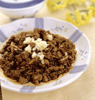 2、将鸡肝末放入锅内,加入鸡汤稍煮一会儿,加入酱油和蜂蜜使之入味即成。