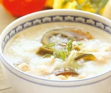 3、把大米洗净,放入沸水锅中煮,当米粥将熬好时,放入松花蛋丁、酱油、味精;另用炒锅,放入花生油,炸葱花成金黄色,出葱香味时,倒入米粥中,至粥熬好以后,将排骨配到粥中,即可食用。