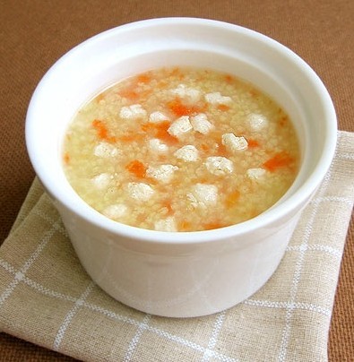 制作方法:胡萝卜洗净去皮,放锅内煮熟后切成特别小的丁另取一锅,倒入水和胡萝卜丁。再将嫩豆腐边捣碎边加进去,一起煮。煮5分钟左右,汤汁变少时,将鸡蛋打散加入锅里煮熟,即可。