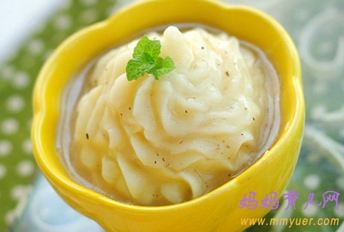·取鸡汤2勺,加入少许盐,稍煮,浇到土豆泥中即可。