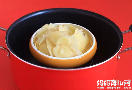 1、土豆洗净,去皮切薄片,放入小汤锅中。