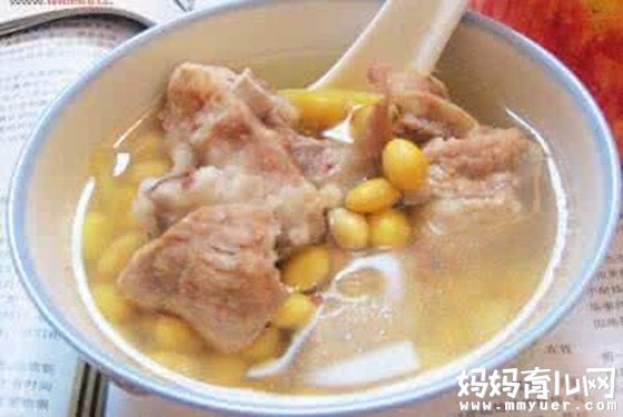 原料:排骨100克,鲜黄豆60克,姜1片,盐、香油各适量。