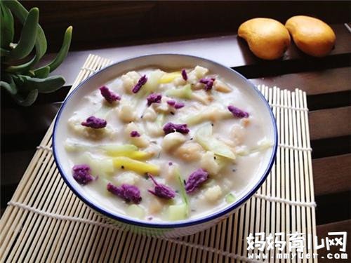 5、红薯泥放入白米粥中,搅拌均匀即可。