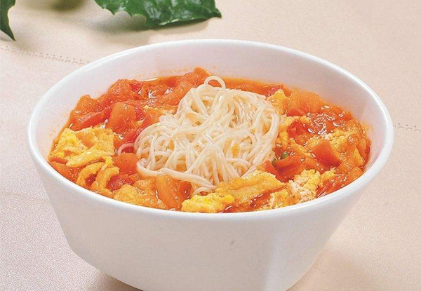 原料:煮烂切碎的细面条、切碎的葱头、去皮后切碎的西红柿、鸡蛋、小青菜心,适量高汤,熬熟的植物油。