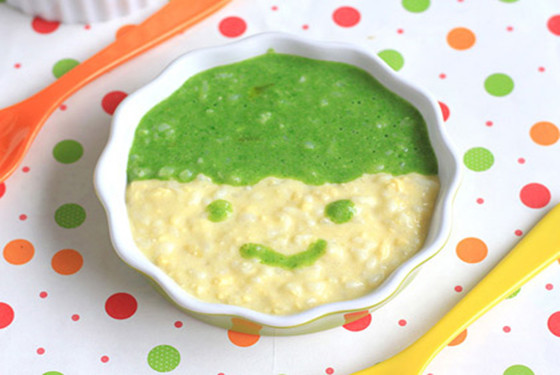 4、在取出的蛋黄中加入米糊,用小勺一点一点加入菜汁,调成糊状即可。