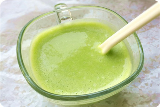 1、新鲜青菜清洗干净,去菜帮留菜叶,开水焯透,自然晾凉,用搅拌机搅成糊状,用煮过的纱布将菜汁挤出。