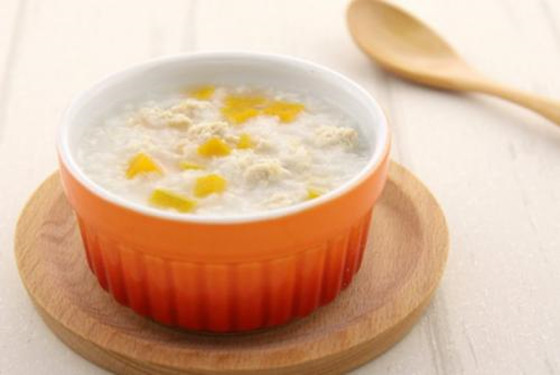 食材:米适量,肉汤(或鱼汤、菜汤)适量,蛋黄1个。