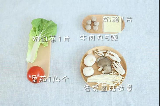 奶酪适量、牛肉丸少许、番茄4/1个、各类菌菇适量