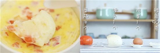 鸡蛋一个、番茄半个、鳕鱼50g、馒头适量