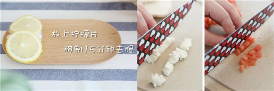 1、鳕鱼切碎,放上两片柠檬腌制15分钟。要是没有柠檬也可以用葱或姜片去腥。馒头和番茄去皮后切成小块。