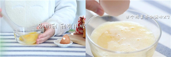 2、碗里打1个鸡蛋,搅打均匀。蛋壳可不要扔掉哦,等下有大用处哈。取半个蛋壳倒满水,蛋液中倒入3份。