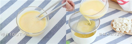 3、继续用筷子搅打,搅打100下哦。拿一个上锅蒸的容器,筛入2/3蛋液。