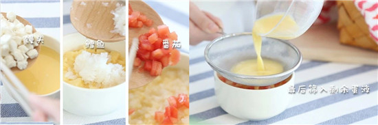 4、依次加入馒头、鳕鱼和番茄,加一种食材就要铺平一次哦。最后再筛入剩余的蛋液。筛入蛋液做出来的蛋羹表面更顺滑,无气泡。