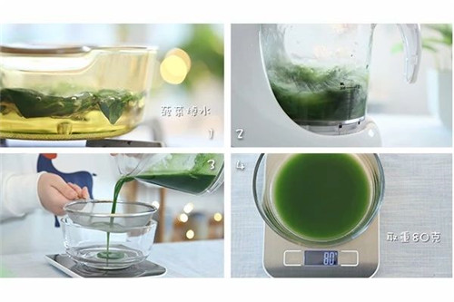 1、菠菜洗净后焯水2分钟,放辅食机中加一点水搅拌成糊,过筛后取汁80克。焯水步骤很重要,一定要有。过筛是为了颜色更纯正,可以根据情况省略。