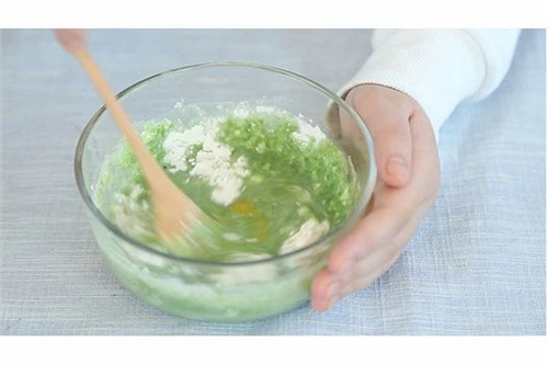 2、80克蔬菜汁、1个鸡蛋和35克面粉混合。要是没能称重,可以按照这样的顺序混合。面粉中打入一个鸡蛋,然后一点点加蔬菜汁/糊,但一定要确保搅拌后的性状如下个步骤。