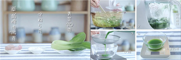 食材清单:淀粉5g、青菜30g、草鱼腹肉75g
