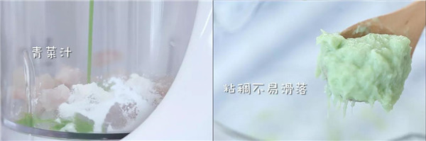 3、将鱼肉、淀粉、青菜汁全部倒入辅食机中搅打成泥糊状。打好的面糊状态应该如图,粘稠不易滑落。面糊调得太稀或者太稠都不利于面线成型哦。