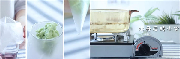 4、裱花袋套在玻璃杯中,将面糊倒入袋中,在尖尖头剪个小孔。小孔的大小决定了面线粗细。给九个月宝宝添加,要剪得小点,这样挤出来的面线才会足够细些。水煮开后再转小火。