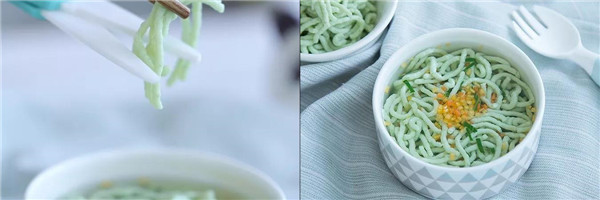 2、小月龄宝宝要将长条的面线剪成小粒段后再添加;而大月龄的宝宝可以装盘子里,让宝宝自己收抓着吃,这样能锻炼宝宝的自主进食、手抓和咀嚼能力。