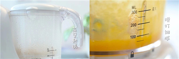 1、南瓜切小块后,放入辅食机中蒸至软烂。蒸好后放入辅食机中,加入少许温开水,搅拌细腻。