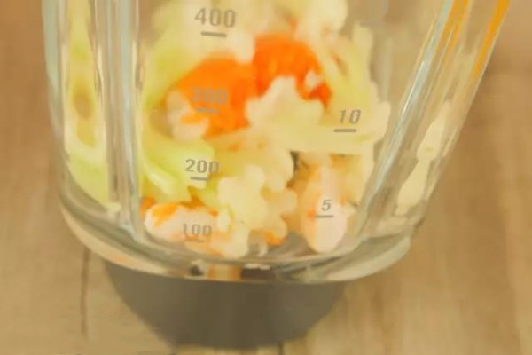 8.将炒切好的菜花和虾肉胡萝卜丝一起倒入搅拌机中,加入适量的温水搅拌;