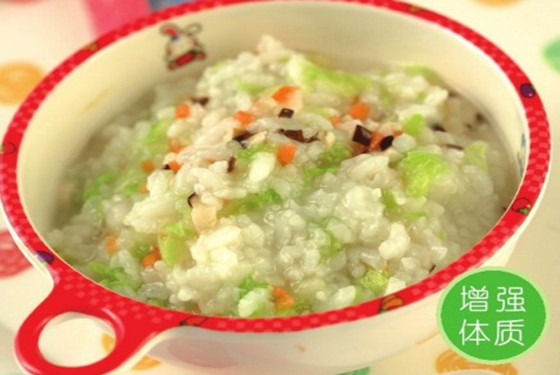 原料:牛肉末20克,香菇丁、大白菜丁、胡萝卜丁各适量,白米饭半碗、酱油、盐各少许。