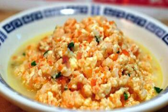 7、炒至将熟时再放鸡蛋碎,一起炒匀后加盐调味即可。