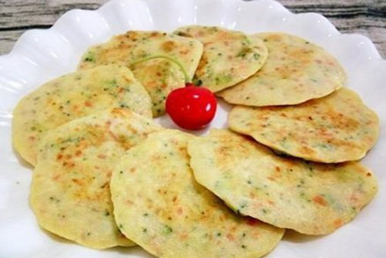 4、平底锅,倒入一点点油就可以了,小火,用勺子舀半勺面糊,慢慢倒入锅中,等表面差不多要凝固时就可翻面煎另一面了,煎至两面微黄就可以了。