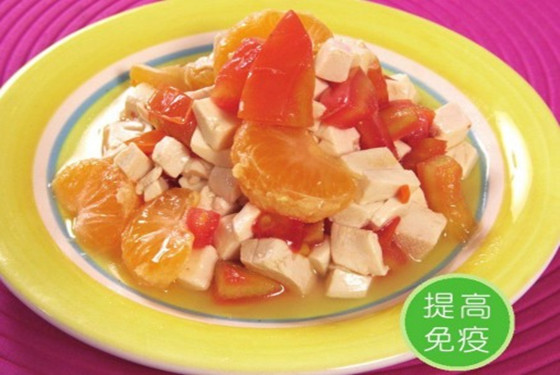 原料:嫩豆腐30克,草莓15克,去皮橘子3瓣,西红柿15克。