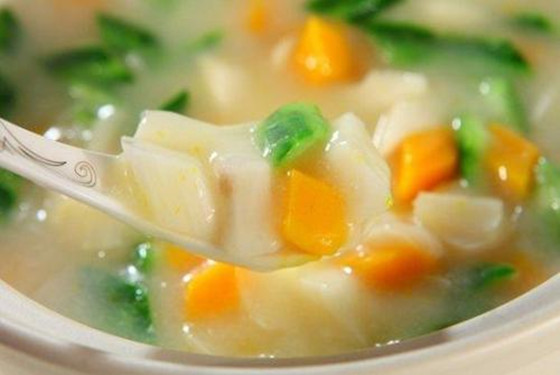鸡蛋面片汤:取面粉,打入鸡蛋,加水揉成面团,接着压成薄片,放入锅中煮,记得放之前要加水,且鸡蛋面片尽可能薄。