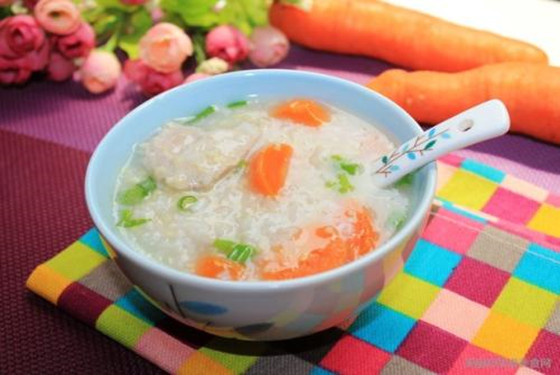 胡萝卜泥青菜肉末菜粥:将胡萝卜、青菜煮熟制作成泥。锅内放入肉末、厚粥、高汤(猪肉汤);再加入胡萝卜泥、青菜泥,小火炖开后,加入熬熟的植物油和少量盐煮开即成。