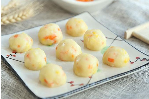 做法:将土豆、胡萝卜、玉米和虾仁洗净,土豆去皮切块在搅碎机中制成泥状,玉米和胡萝卜切碎备用;然后将虾仁剁成泥状后与玉米和胡萝卜碎放入容器中,依次加入土豆泥和低筋面粉搅拌均匀;最后制成丸子状放在锅中隔水蒸熟即可。