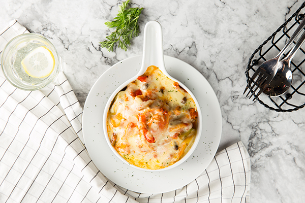 将芝士蔬菜水果泥放入上下160度的温度的烤箱,烤20分钟左右,芝士完全融化即可