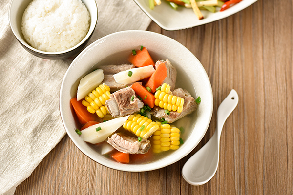 材料:猪排骨300g、胡萝卜50g、玉米1根、盐少许
