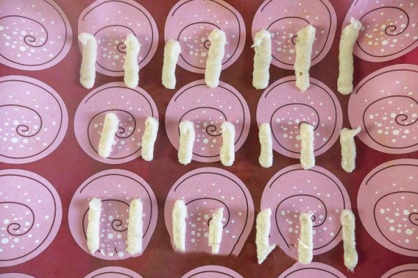7、将烤箱预热到170度,把虾泥挤好铺在油纸上,放入烤箱。每一条虾泥的距离最好1.5倍。