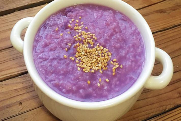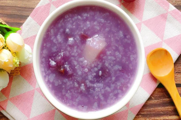 做法:将大米提前洗净后放入清水中浸泡半个小时,然后将紫薯去皮后放入搅碎机中制成紫薯泥备用;将大米放入锅中加入适量的清水后用大火煮开,煮开后再放入准备好的紫薯泥入锅中,用勺子搅拌均匀,当粥煮至粘稠后即可起锅。