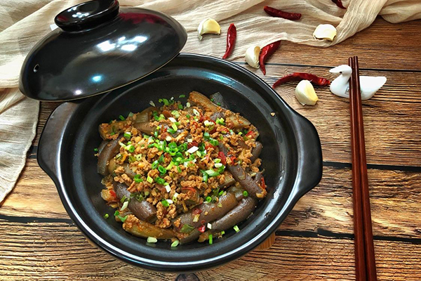 材料:茄子半根、猪肉25g、葱花少许、橄榄油少许、盐少许