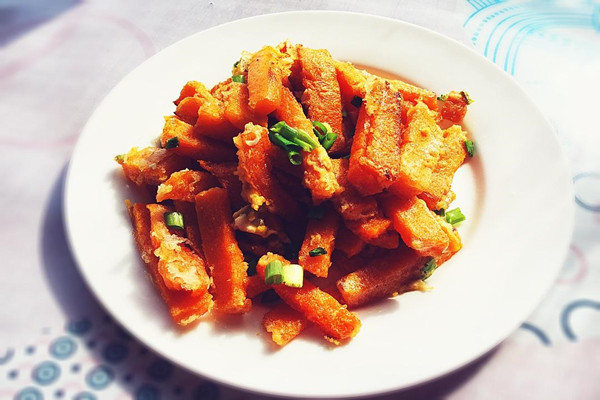 7、接着锅中再放一点点油,放入碾压碎的咸蛋黄,小火慢慢炒,炒至咸蛋黄出泡沫为止。接着再放入炸好的南瓜条和白糖,接着将他们全部翻炒均匀就可以出锅了。