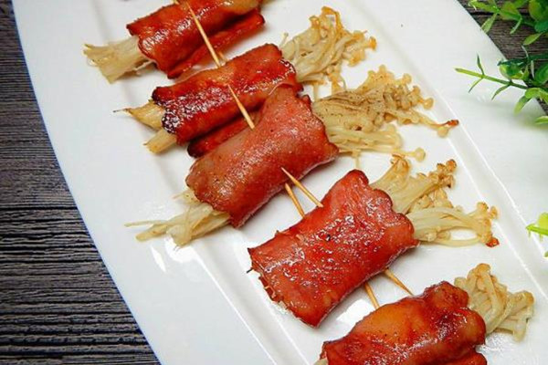 做法:将新鲜的金针菇洗净切掉根部,培根切成薄片备用,然后将适量的金针菇放入培根中再用牙签进行固定;锅中倒入适量的橄榄油,再将培根金针菇卷放入锅中,煎制金针菇微微焦黄即可。