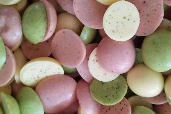 做法:将火龙果、南瓜和胡萝卜洗净去皮,再分别放入料理机中制成泥状,将鸡蛋敲碎后留取蛋黄备用,倒入适量的糖粉用打蛋器将蛋黄打散;然后加入准备好的果蔬汁继续打发,再加入适量的奶粉和大豆磷脂,最后倒在裱花袋中制成溶豆,烤箱中烤熟即可。