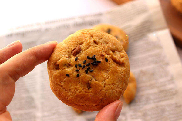 然后将奶粉加入其中,搅拌成顺滑无颗粒的面糊,撒一些黑芝麻调成糊,取少许面糊定型然后放在180度烤箱里烤10分钟即可