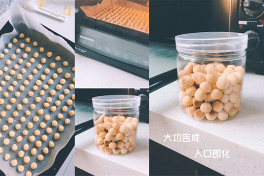 4、然后将这些小方块搓成圆,平整的放进烤盘里面,烤箱预热十分钟,入烤箱,然后转150度,烤12分钟就可以了,制作方法很简单,而且还比外面的好吃很多。