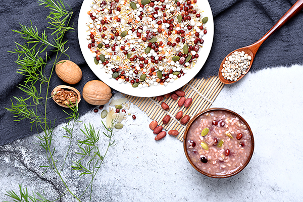 取少量坚果研磨成粉,将蔬菜剁碎或是搅拌成泥,用大米或是黑米煮粥,放入坚果粉末,粥煮到半熟的时候加入蔬菜,搅拌均匀等到粥煮熟即可。