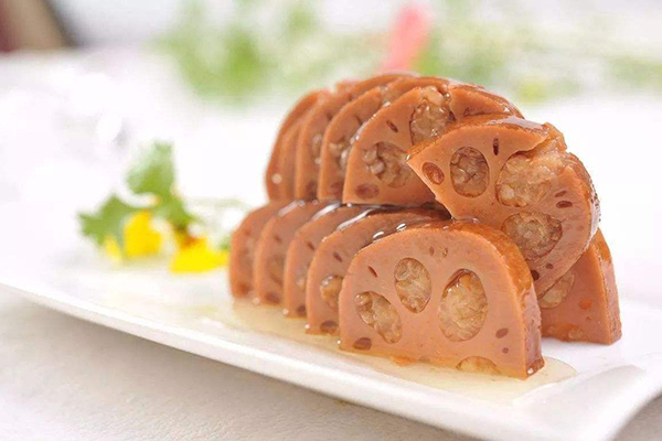 将莲藕一段洗干净,切下备用,将其竖着放在盘子里,灌进去混着适量白糖糯米,敲打一下外部,使糯米压紧;然后将莲藕放在锅里,隔水蒸,月半小时后取出倒干净莲藕水;然后将糯米藕放置常温后,切厚度适中的片,在上面淋上一些桂花酱即可。