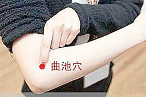 2、曲池穴:这个穴位在手肘附近,当孩子发高烧时妈妈可以按压这个穴位,以此来帮助孩子激发身体里的阳气,同时达到清热解毒,退热泻火的作用。