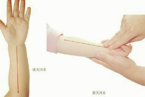 第三步:推天河水,天河水位于前臂正中,总筋至洪池成一直线,用食指中指指面向腕推向肘,称清天河水;每次按摩15分钟,从小儿腕横纹均匀推到肘横纹即可。